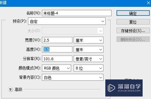 在ps里新建文件 2.5*3.5cm 分辨率为101.6上面算出来的数字。