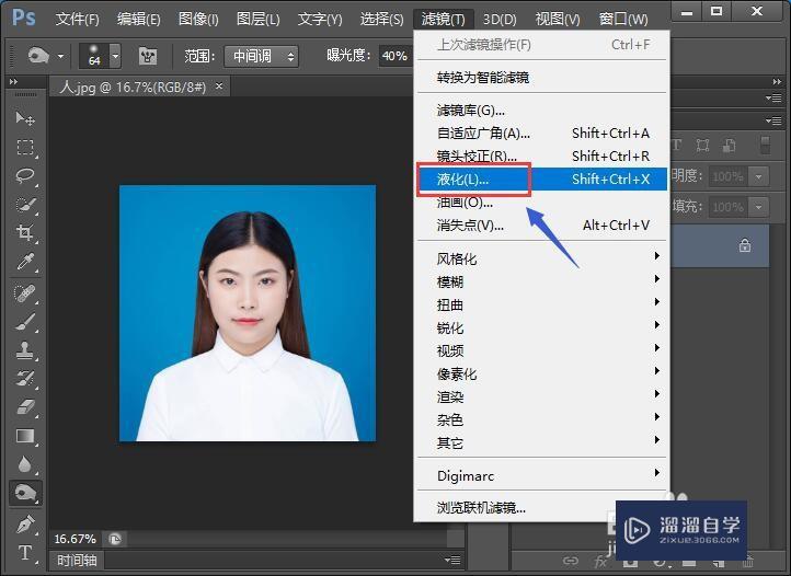 1.在PS软件中打开人物图片,点击“滤镜”。