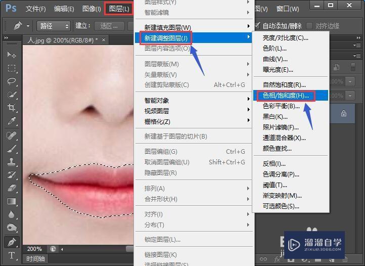 选中菜单栏中的“图层”/“新建调整图层”/“色相/饱和度”。