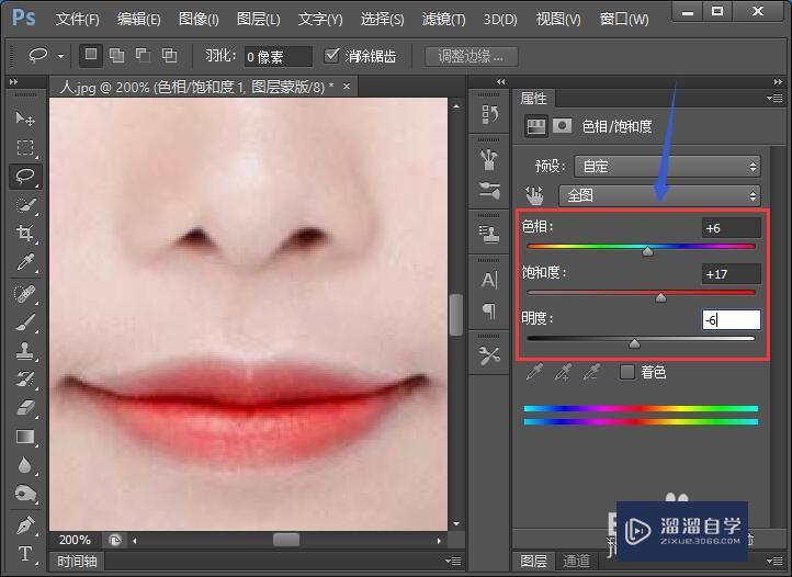 接下来,我们就在右边的属性栏调节色相和饱和度即可,嘴唇就修饰好了。
