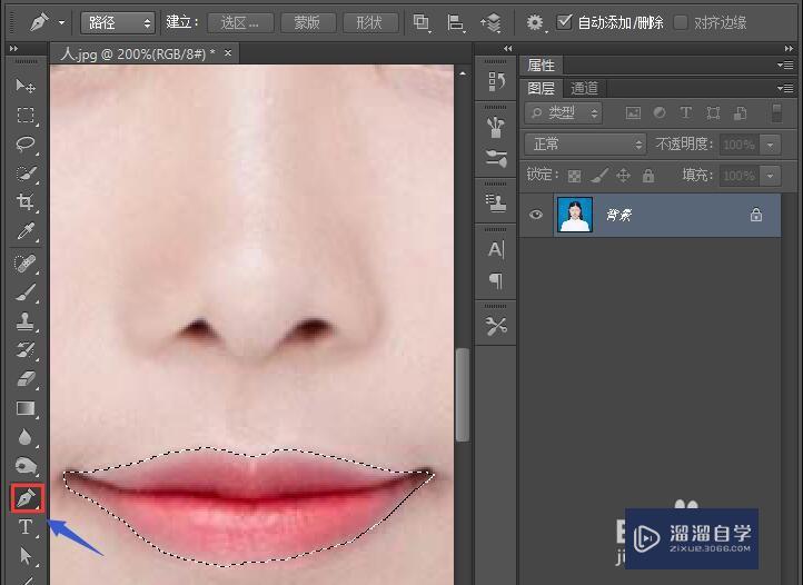 点击“钢笔工具”,抠出嘴唇,按“Ctrl+Enter”,变成选区。