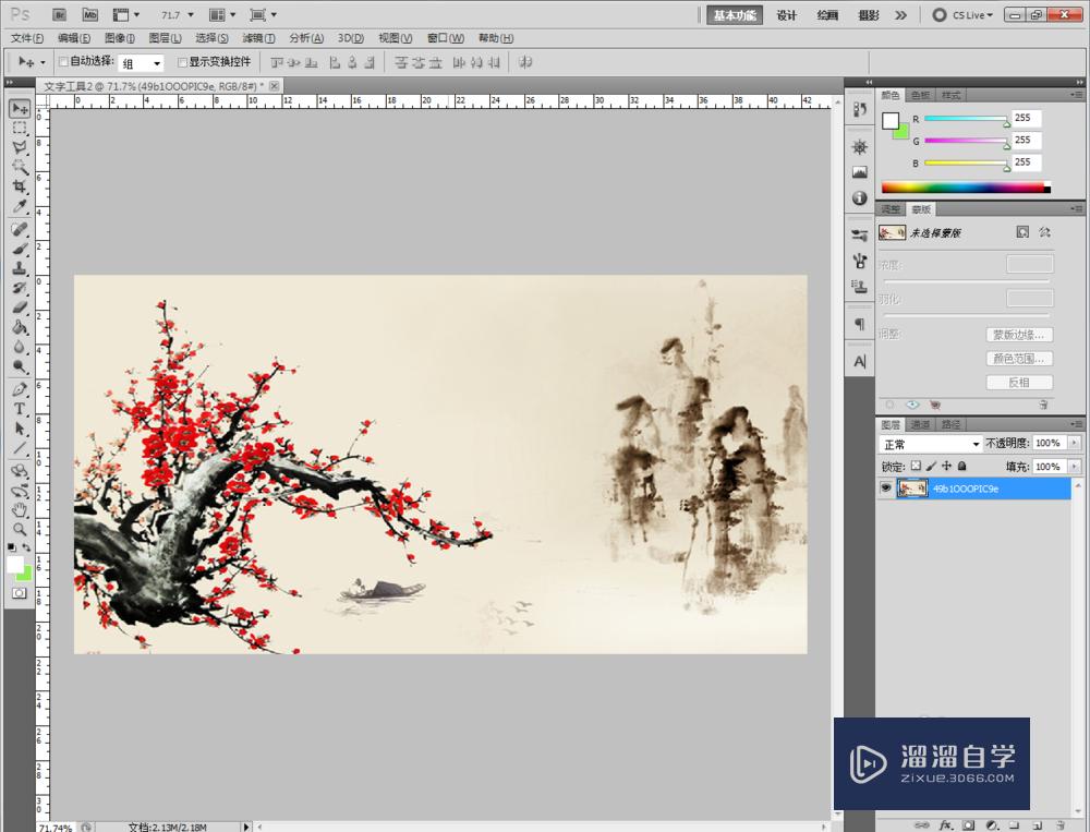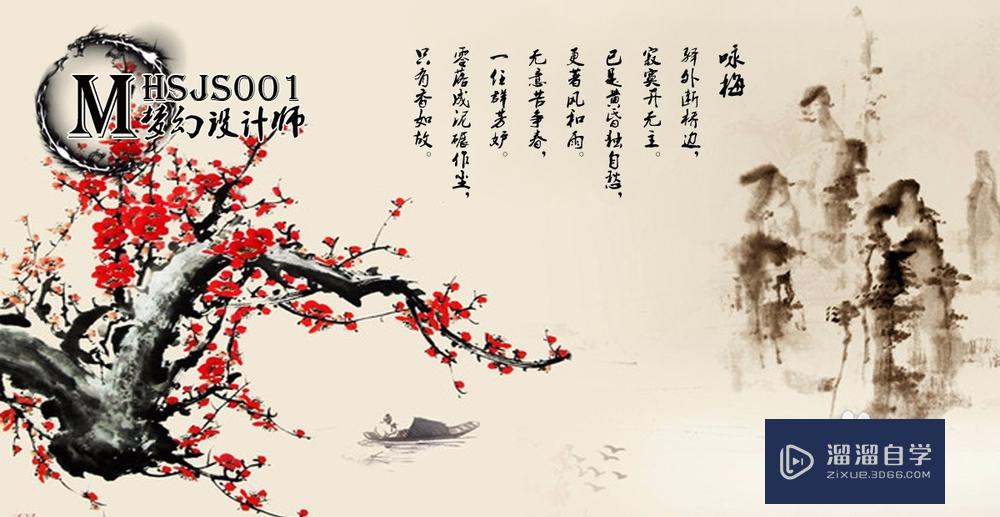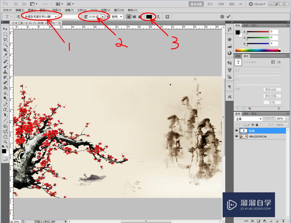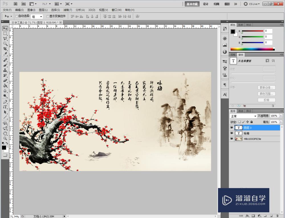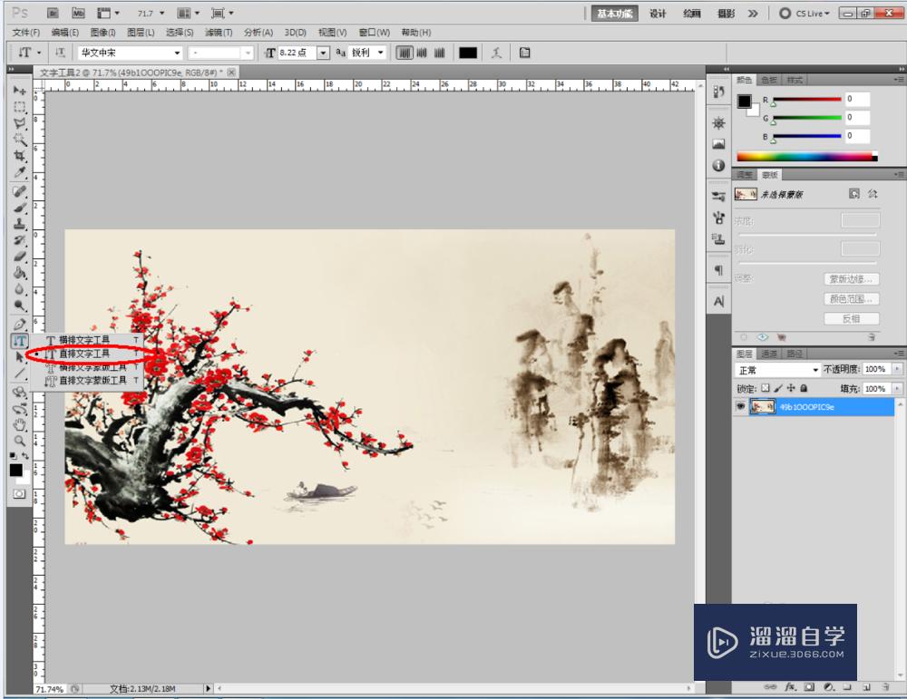打开一张中国古典梅花山水图,点击【竖排文字工具】,点击作图区域,设置好文字的字体、颜色、大小等参数后,开始编辑竖排主题文字‘咏梅’;