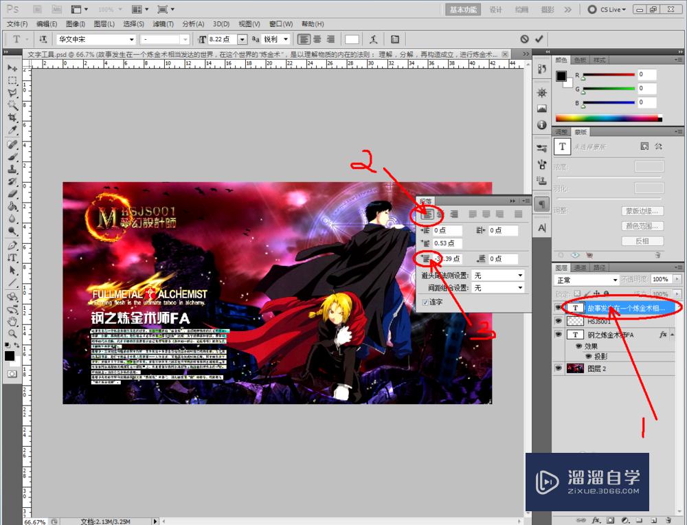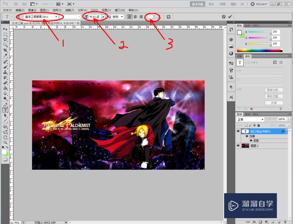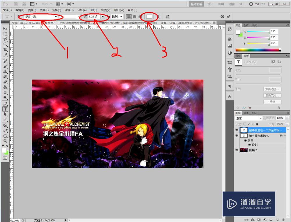 点击【横排文字工具】,鼠标点击下作图区,先编辑主题部分。按图设置好文字的字体、颜色、大小等参数后,开始编辑文字内容。编辑完成后,给字体图层加一个图层样式效果;