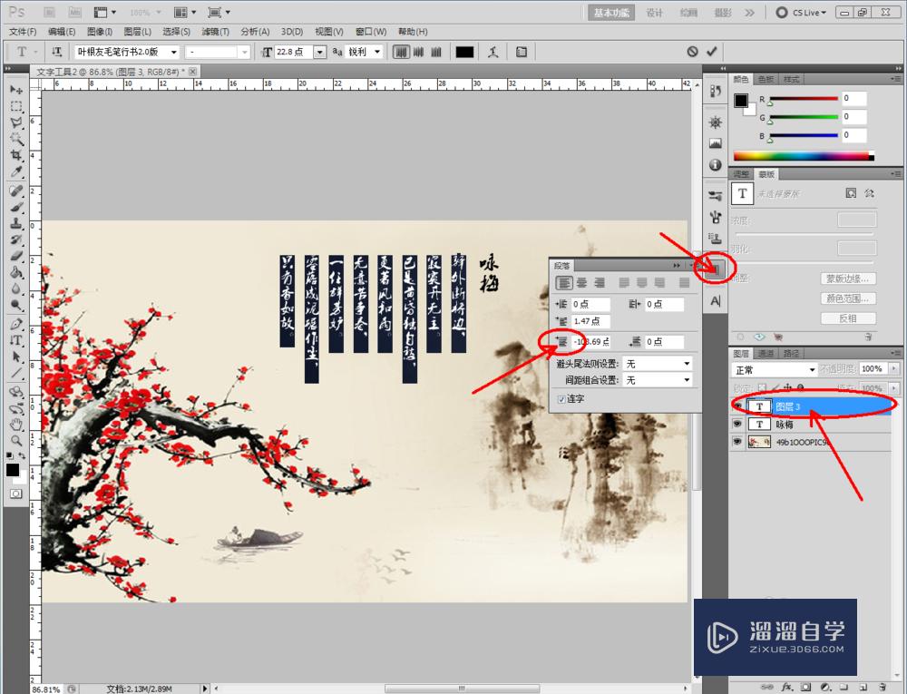 完成后编辑诗句部分。点击作图区域,按图设置好文字的字体、颜色、大小等参数后,开始编辑文字内容。编辑完成后,点击【段落】,调整好竖排列距参数;