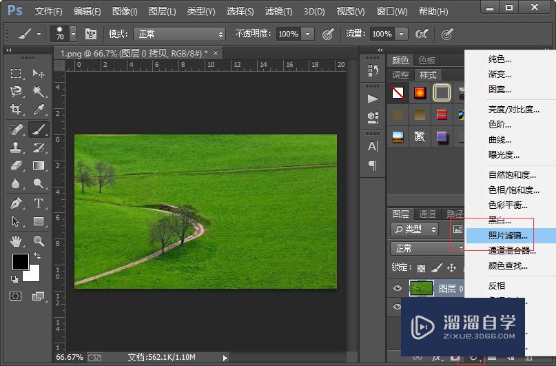 接着,我们找到图层面板下面的创建新的填充或调整图层的按钮,并点击;在弹出的菜单栏中,我们找到照片滤镜,并点击选择。
