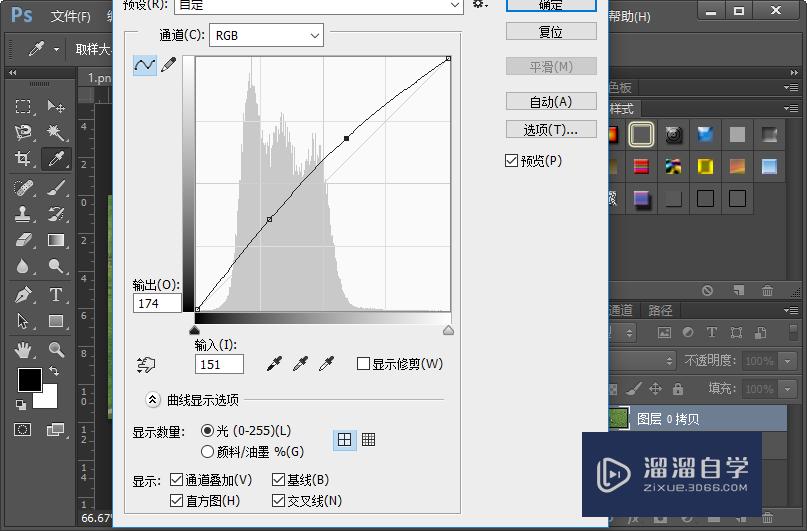 然后我们使用曲线来调整当前图层,具体的参数设置,我们可以参照下图。这样我们就把当前图层调的稍微亮一些了。